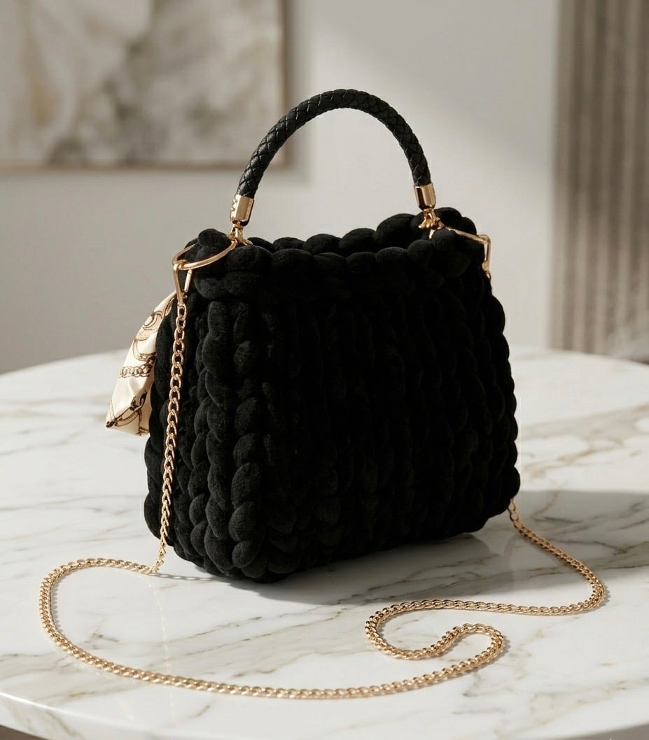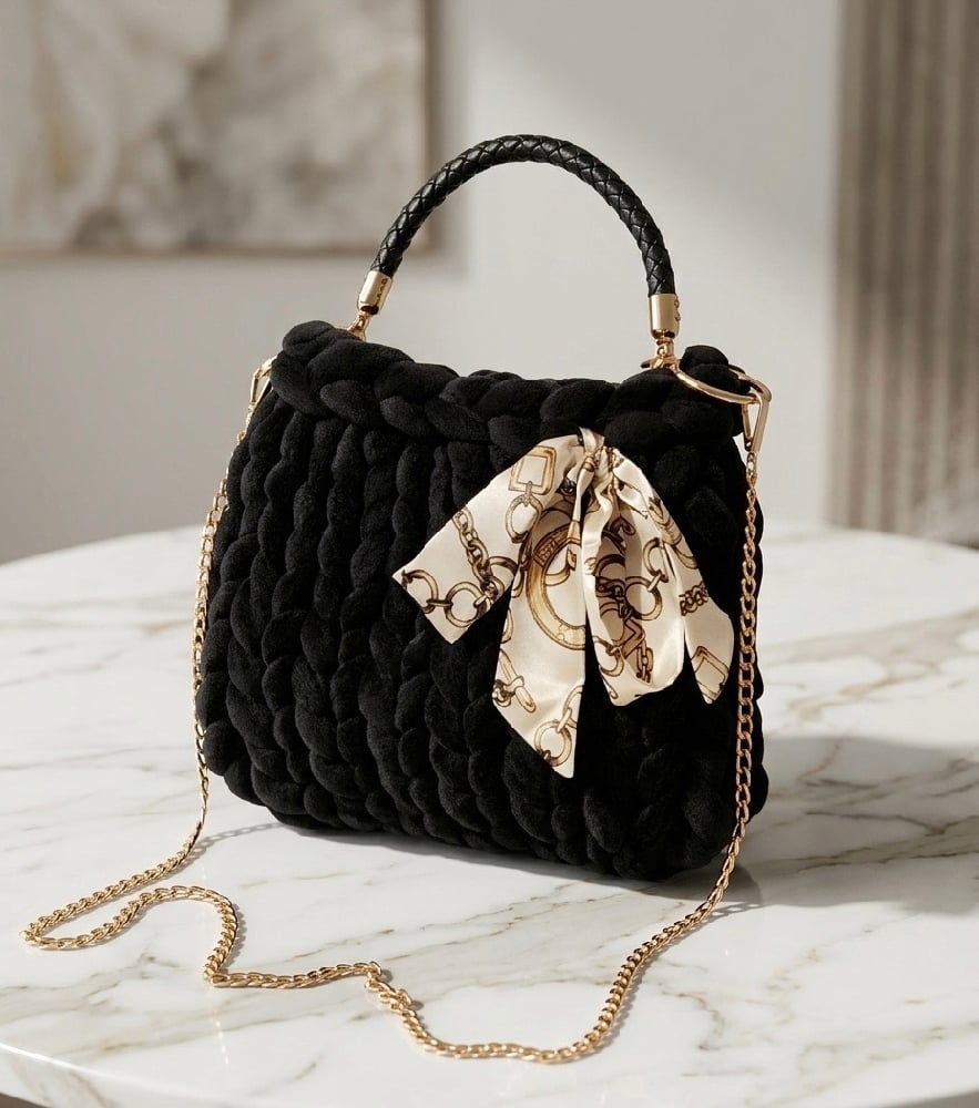 Each bag is **hand-knitted with care**, giving it a soft yet sturdy structure that holds your items while still looking fashionable. The chunky knit texture makes every bag unique and adds a statement piece to any outfit.